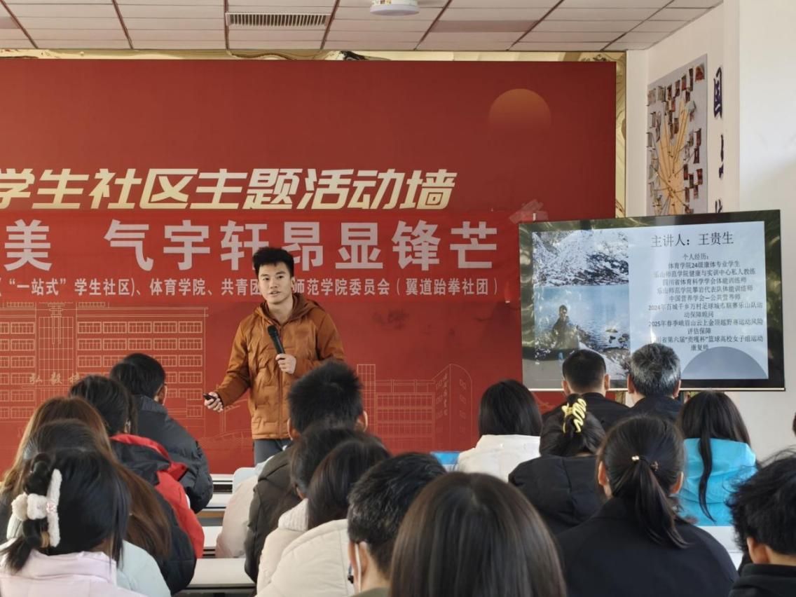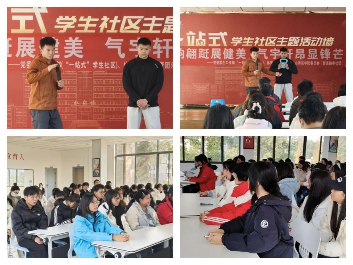 活动伊始,体育学院王贵生阐述了科学健身的重要性,指出规律运动对缓解久坐不适、改善体态以及促进心理健康的积极作用。随后,重点介绍了有氧运动、抗阻训练与核心强化三大居家健身类型。在理论讲解的基础上,结合现场动作示范与实操指导,详细解析了深蹲、俯卧撑、弓箭步、平板支撑等基础动作的技术规范与训练要点,强调了动作标准性与训练安全性。整个讲解过程深入浅出,现场气氛热烈,互动活跃。最后,翼道跆拳社团同学展示了跆拳道基础礼仪与防身招式,动作刚劲有力,气势昂扬饱满,展现了青年学子好的体育素养与精神风貌。